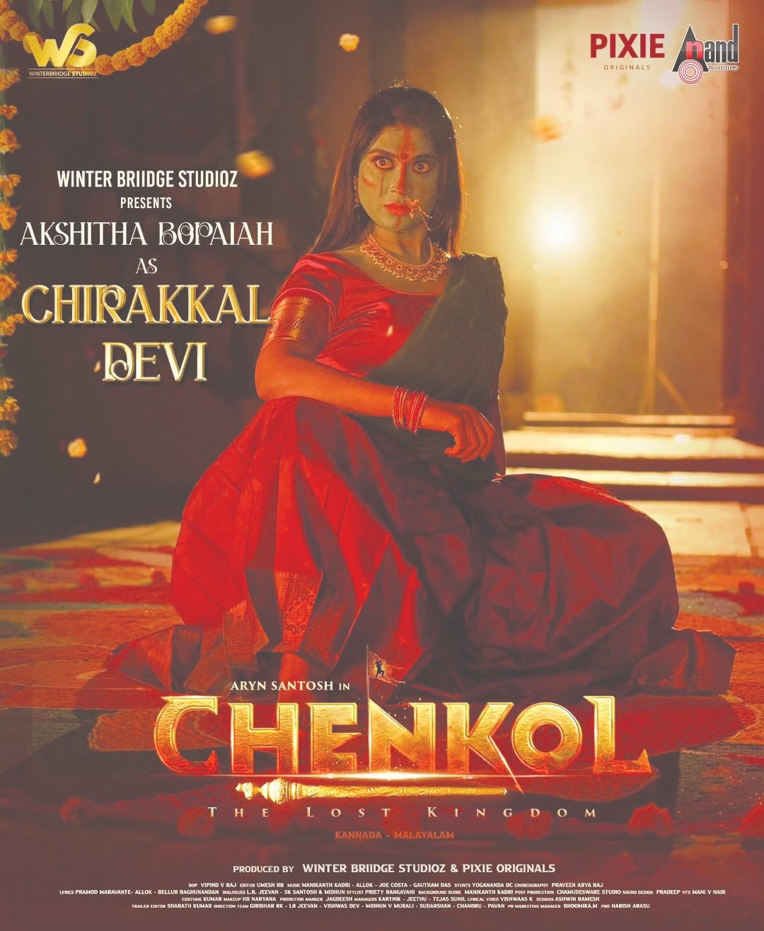 Actress Akshitha Bopiah, who earlier appeared in glamorous and bold roles in films like “Kamal Sridevi” and “Flirt,” is now stepping into a completely new avatar. In her upcoming periodic film Chenkol, written, directed, and acted in by Santosh Aryan, she will be seen portraying a Devi (goddess). Akshitha plays the role of “Chirakkal Devi” in the film. Recently, the teaser along with her first-look poster was released. Expressing her excitement, Akshitha says, “This is the first time I am acting in a period film and also portraying a goddess.”
